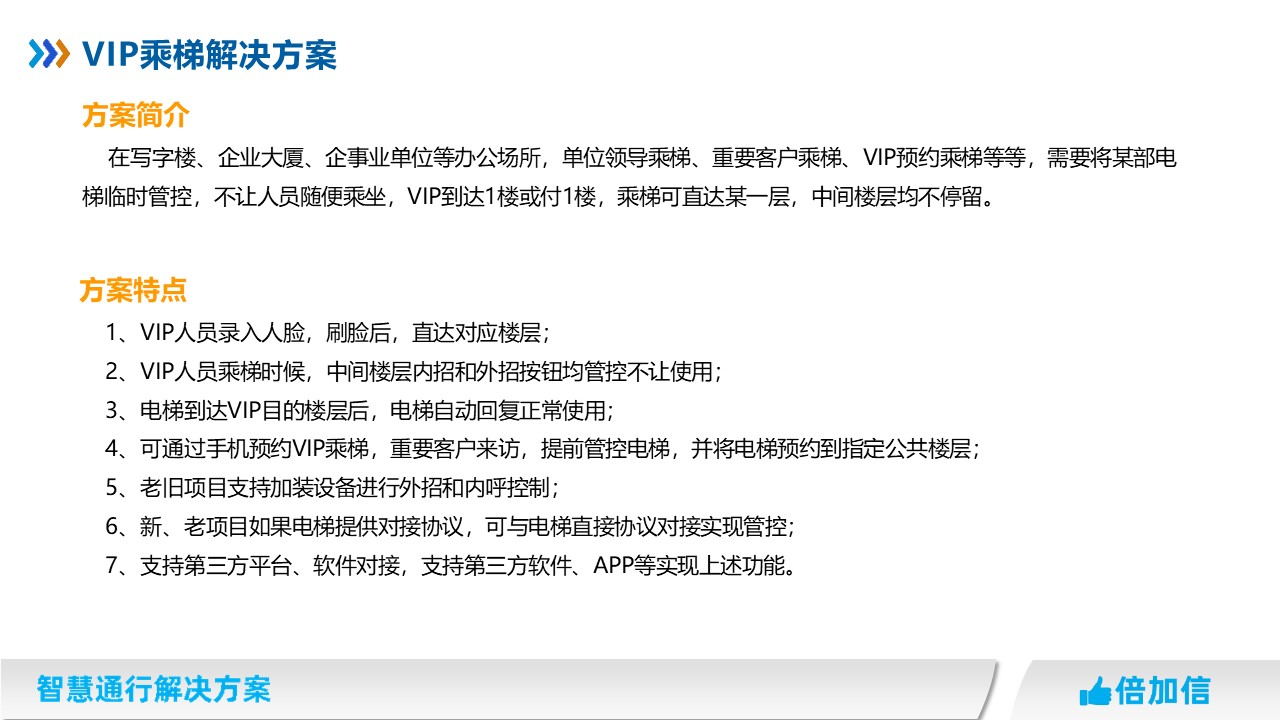 在寫字樓、企業(yè)大廈、企事業(yè)單位等辦公場所,單位領(lǐng)導(dǎo)乘梯、重要客戶乘梯、VIP預(yù)約乘梯等等,需要將某部電梯臨時管控,不讓人員隨便乘坐,VIP到達1樓或付1樓,乘梯可直達某一層,中間樓層均不停留。