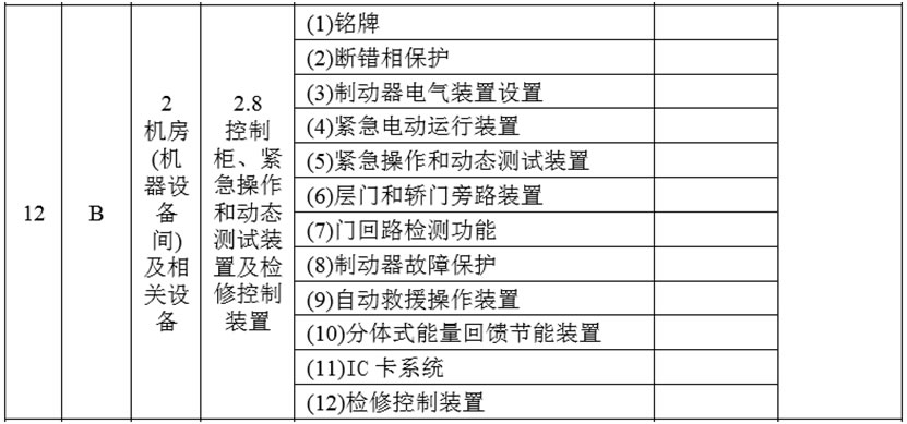 (4)將2.8項(xiàng)的項(xiàng)目及類別調(diào)整為“控制柜、緊急操作和動(dòng)態(tài)測(cè)試裝置及檢修控制裝置B”,在檢驗(yàn)內(nèi)容與要求中增加: