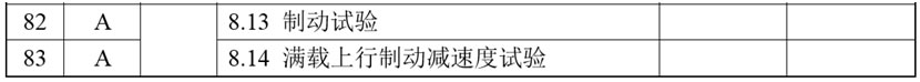 (27)增加8.14項(xiàng),項(xiàng)目及類別為:“滿載上行制動(dòng)減速度試驗(yàn) A”,檢驗(yàn)內(nèi)容與要求為:“裝載額定載重量的運(yùn)載裝置以正常運(yùn)行速度上行,運(yùn)行至傾斜角為最小值區(qū)域時(shí)切斷電動(dòng)機(jī)和制動(dòng)器供電,制動(dòng)過程中轎廂水平方向的平均減速度應(yīng)當(dāng)不大于0.25 gn,垂直方向的平均減速度應(yīng)當(dāng)不大于1.0 gn”;