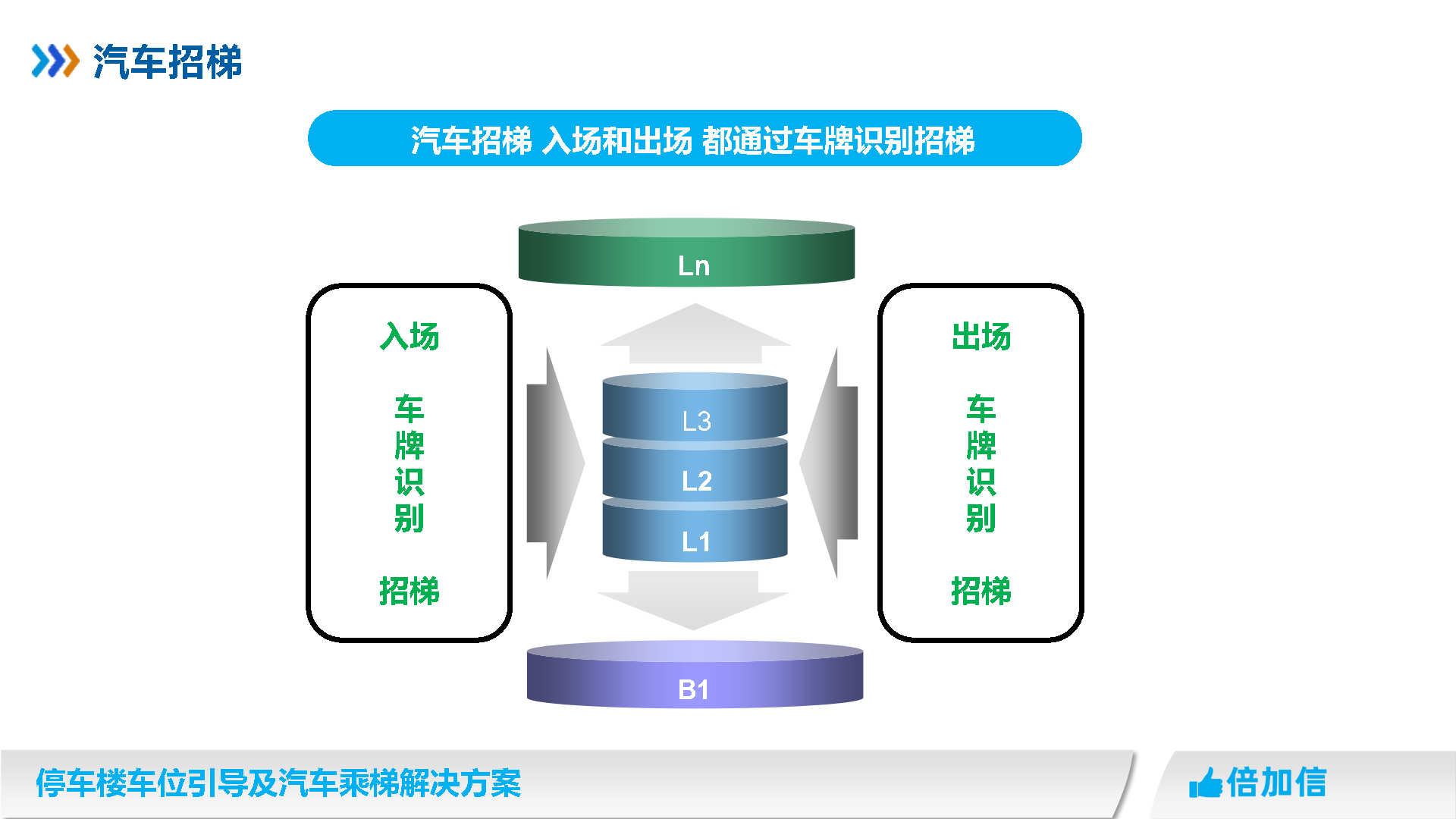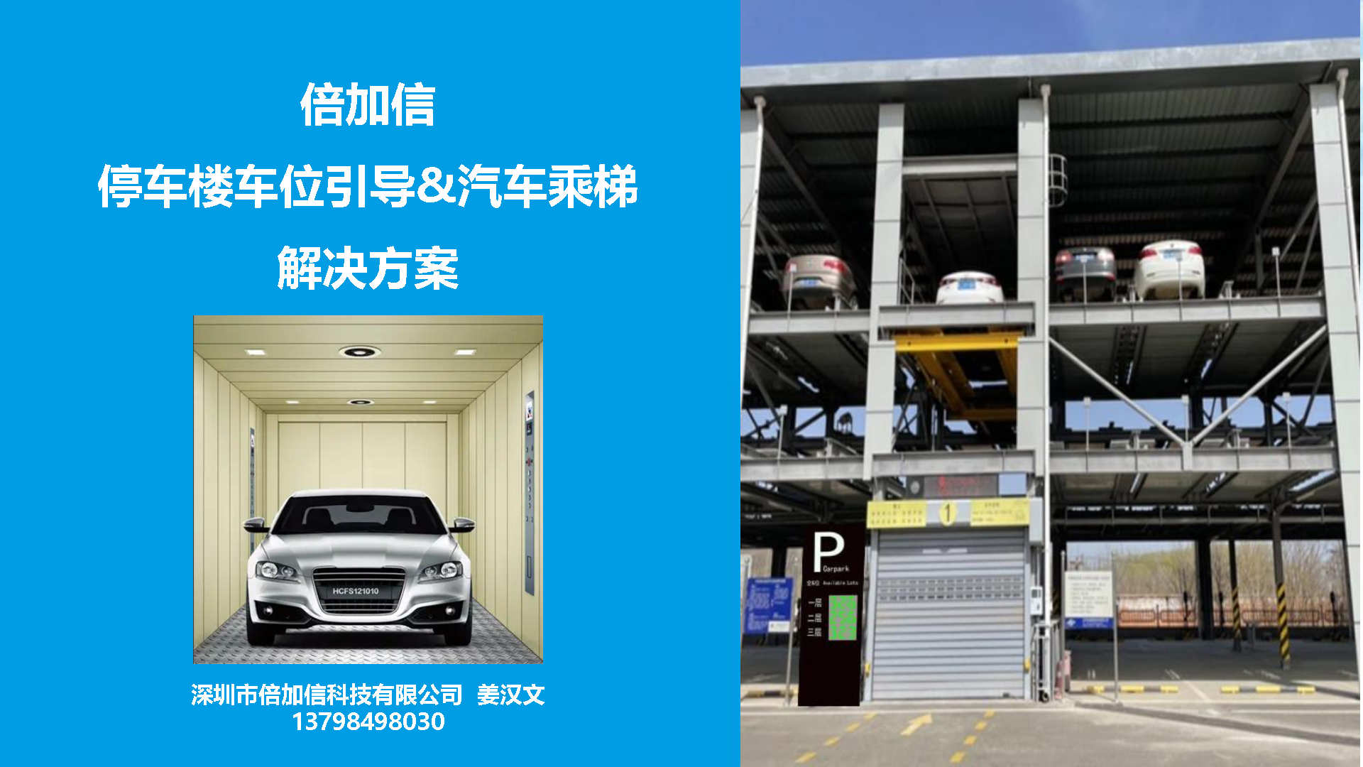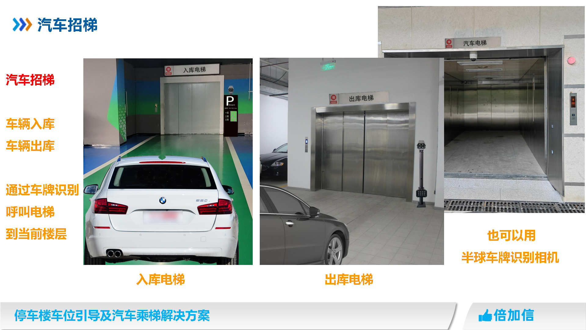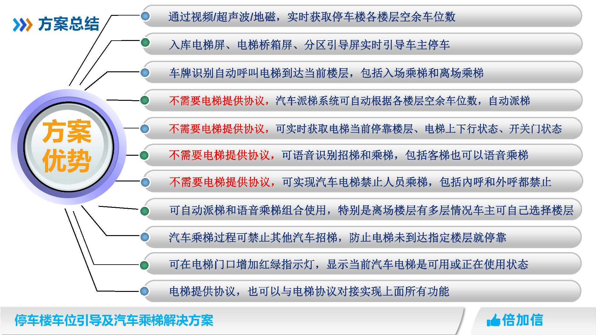 倍加信汽車乘梯系統(tǒng)方案優(yōu)勢 1、通過視頻/超聲波/地磁,實(shí)時(shí)獲取停車樓各樓層空余車位數(shù)/ 2、入庫電梯屏、電梯橋箱屏、分區(qū)引導(dǎo)屏實(shí)時(shí)引導(dǎo)車主停車 3、車牌識別自動(dòng)呼叫電梯到達(dá)當(dāng)前樓層,包括入場乘梯和離場乘梯 4、不需要電梯提供協(xié)議,汽車派梯系統(tǒng)可自動(dòng)根據(jù)各樓層空余車位數(shù),自動(dòng)派梯 5、不需要電梯提供協(xié)議,可實(shí)時(shí)獲取電梯當(dāng)前�?繕菍�、電梯上下行狀態(tài)、開關(guān)門狀態(tài) 6、不需要電梯提供協(xié)議,可語音識別招梯和乘梯,包括客梯也可以語音乘梯 7、不需要電梯提供協(xié)議,可實(shí)現(xiàn)汽車電梯禁止人員乘梯,包括內(nèi)呼和外呼都禁止 8、可自動(dòng)派梯和語音乘梯組合使用,特別是離場樓層有多層情況車主可自己選擇樓層 9、汽車乘梯過程可禁止其他汽車招梯,防止電梯未到達(dá)指定樓層就停靠 10、可在電梯門口增加紅綠指示燈,顯示當(dāng)前汽車電梯是可用或正在使用狀態(tài) 11、電梯提供協(xié)議,也可以與電梯協(xié)議對接實(shí)現(xiàn)上面所有功能