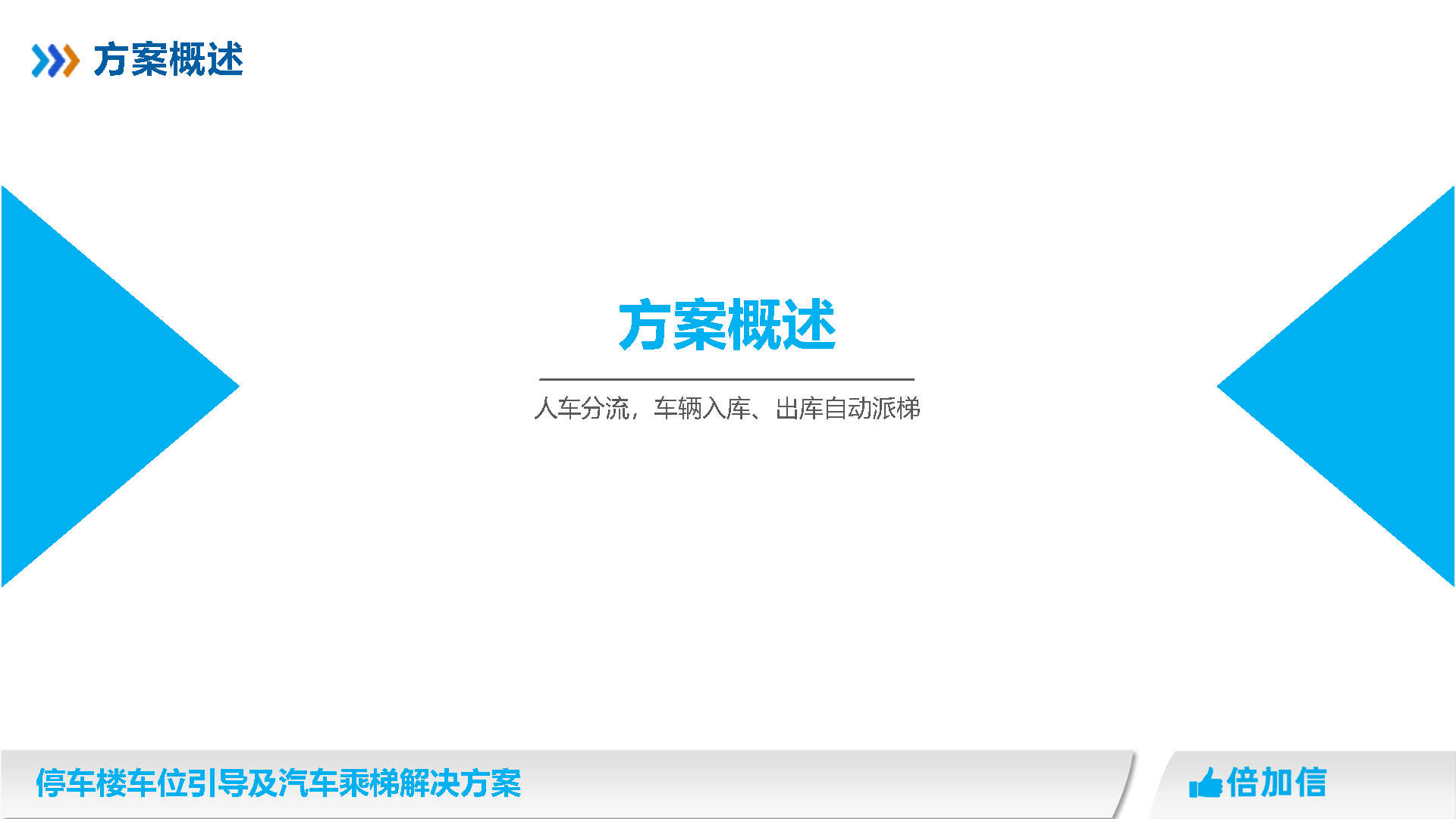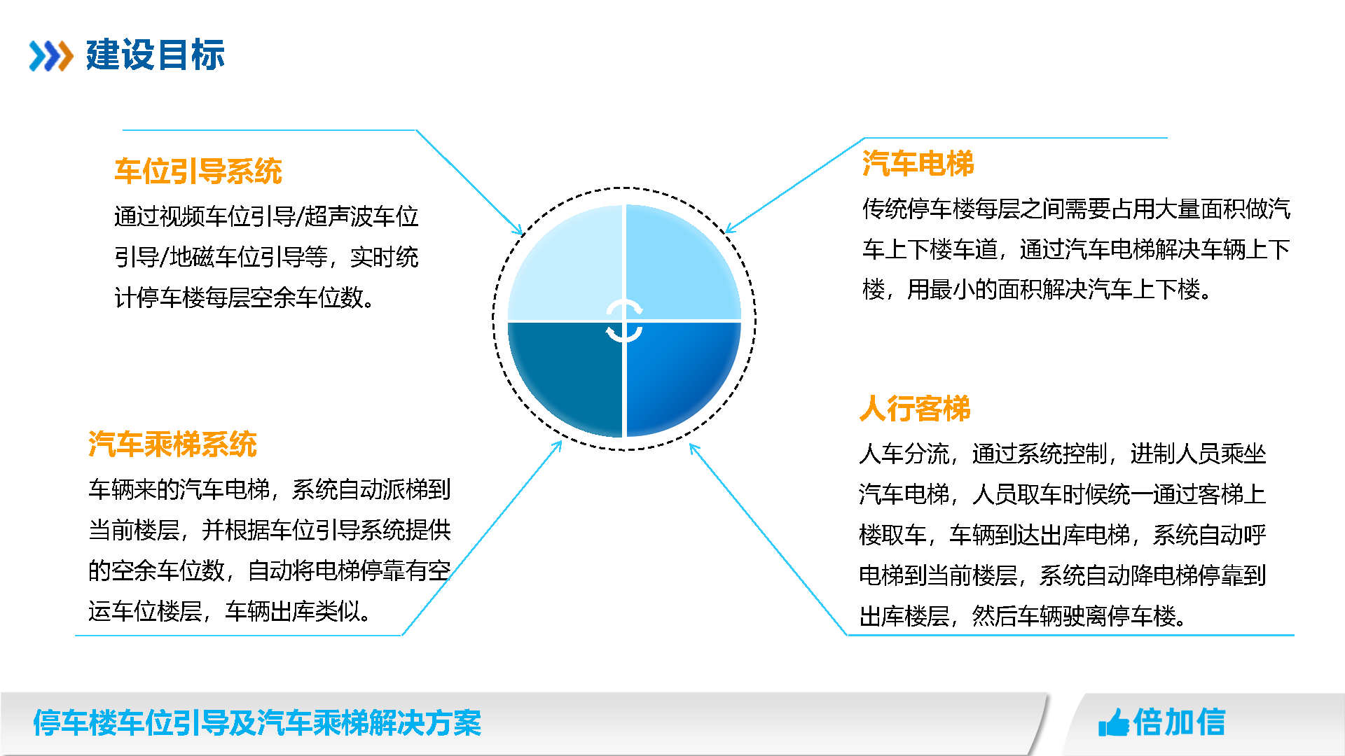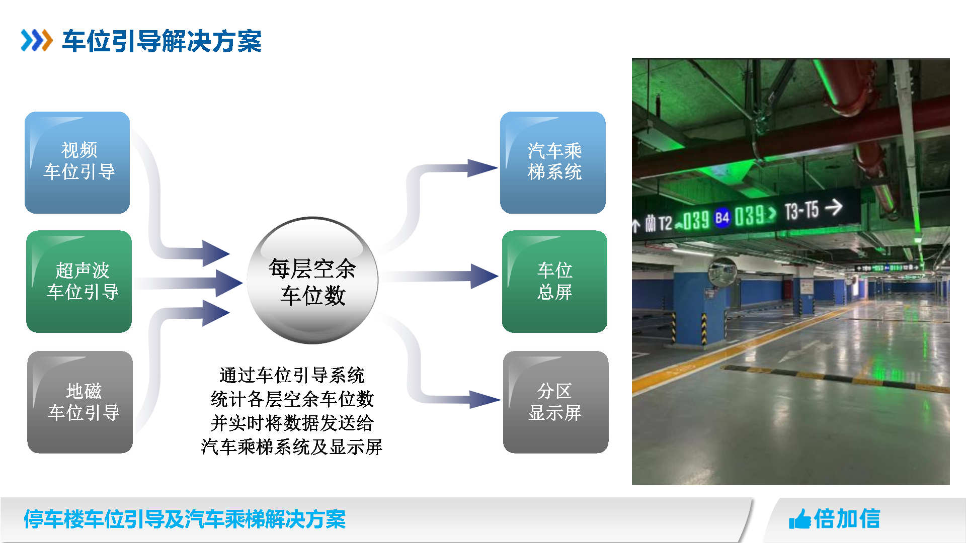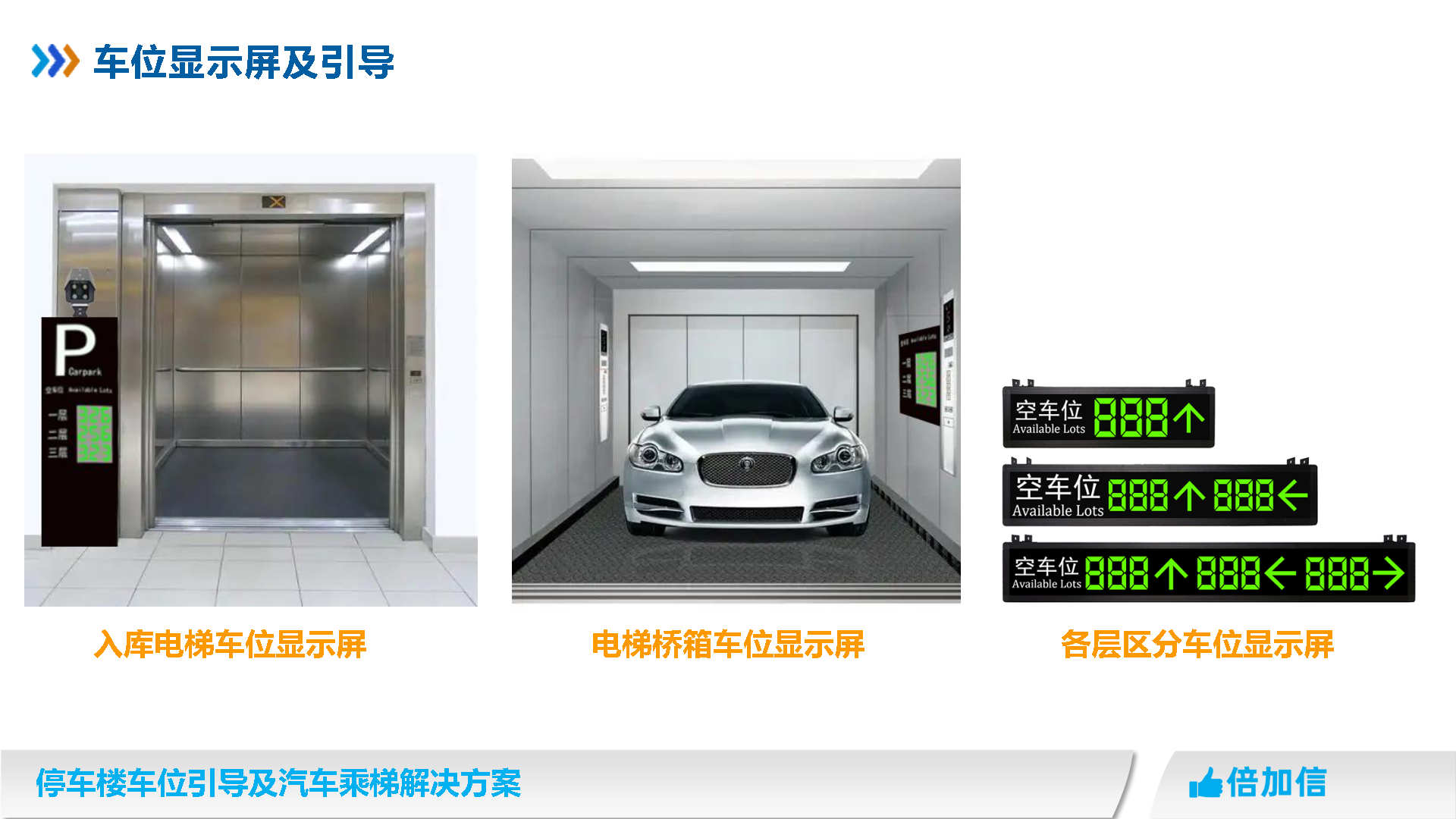 倍加信汽車乘梯系統(tǒng)方案優(yōu)勢 1、通過視頻/超聲波/地磁,實(shí)時(shí)獲取停車樓各樓層空余車位數(shù)/ 2、入庫電梯屏、電梯橋箱屏、分區(qū)引導(dǎo)屏實(shí)時(shí)引導(dǎo)車主停車 3、車牌識別自動(dòng)呼叫電梯到達(dá)當(dāng)前樓層,包括入場乘梯和離場乘梯 4、不需要電梯提供協(xié)議,汽車派梯系統(tǒng)可自動(dòng)根據(jù)各樓層空余車位數(shù),自動(dòng)派梯 5、不需要電梯提供協(xié)議,可實(shí)時(shí)獲取電梯當(dāng)前�?繕菍�、電梯上下行狀態(tài)、開關(guān)門狀態(tài) 6、不需要電梯提供協(xié)議,可語音識別招梯和乘梯,包括客梯也可以語音乘梯 7、不需要電梯提供協(xié)議,可實(shí)現(xiàn)汽車電梯禁止人員乘梯,包括內(nèi)呼和外呼都禁止 8、可自動(dòng)派梯和語音乘梯組合使用,特別是離場樓層有多層情況車主可自己選擇樓層 9、汽車乘梯過程可禁止其他汽車招梯,防止電梯未到達(dá)指定樓層就停靠 10、可在電梯門口增加紅綠指示燈,顯示當(dāng)前汽車電梯是可用或正在使用狀態(tài) 11、電梯提供協(xié)議,也可以與電梯協(xié)議對接實(shí)現(xiàn)上面所有功能