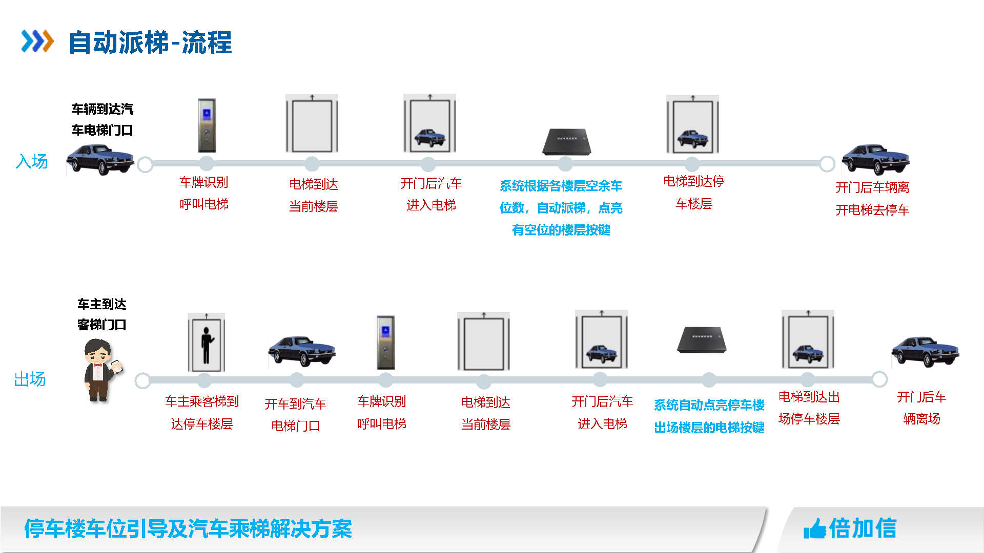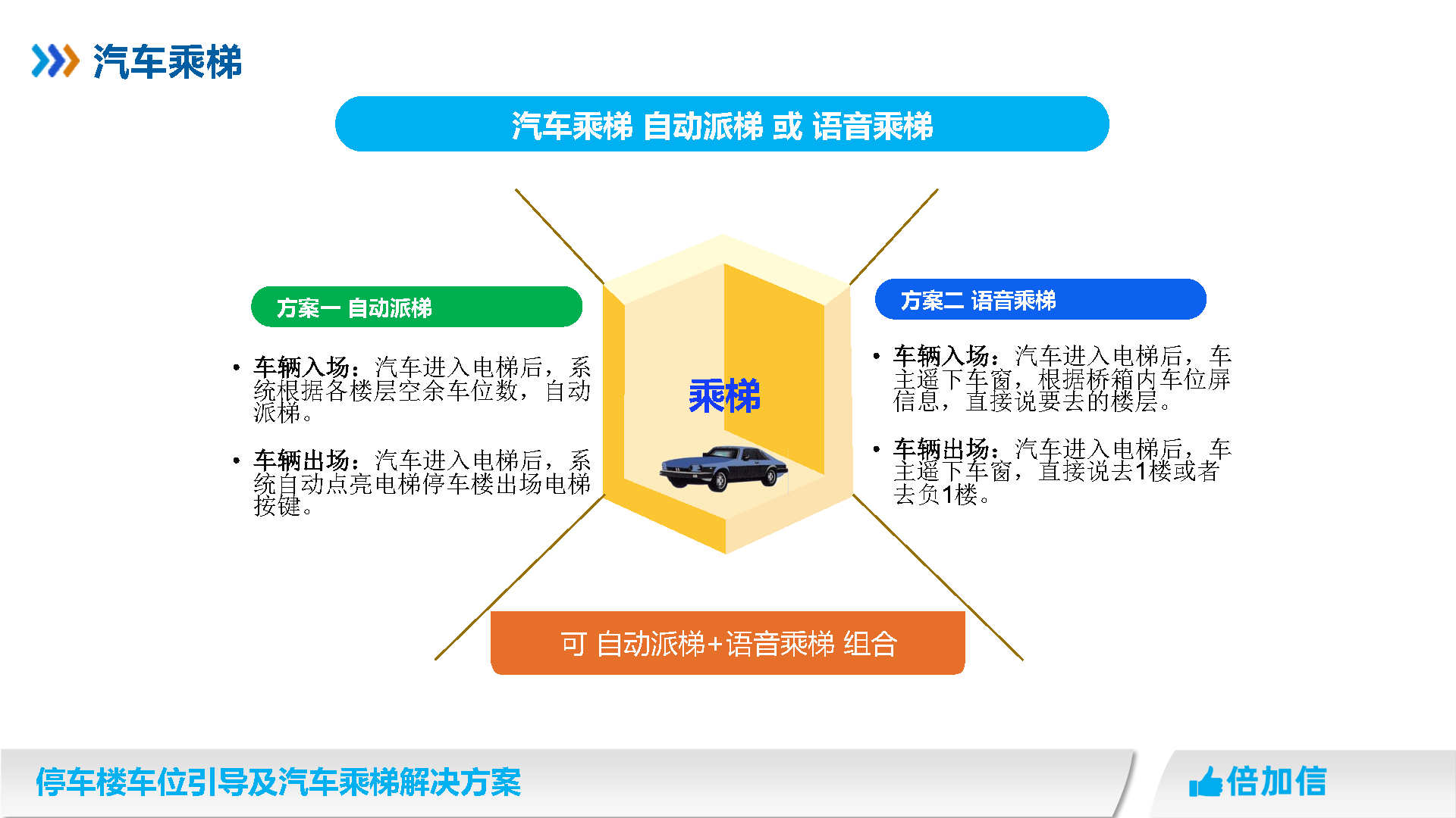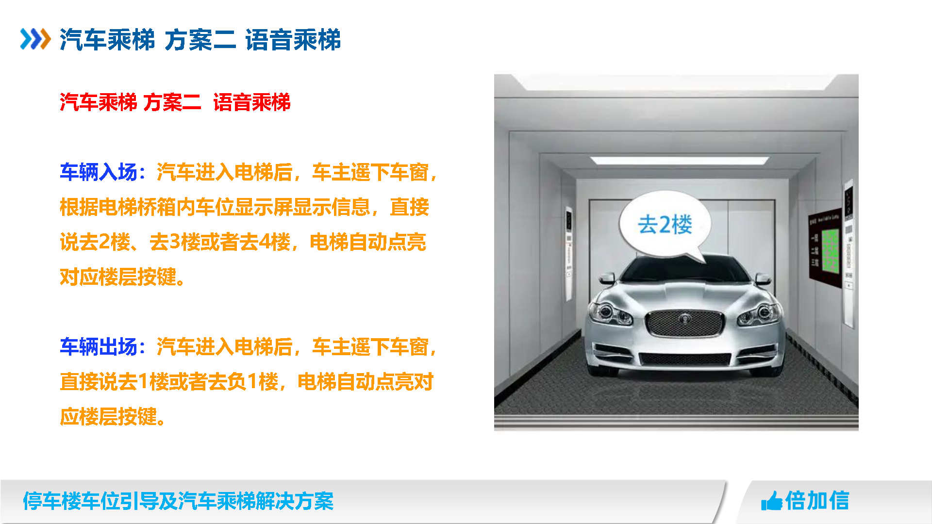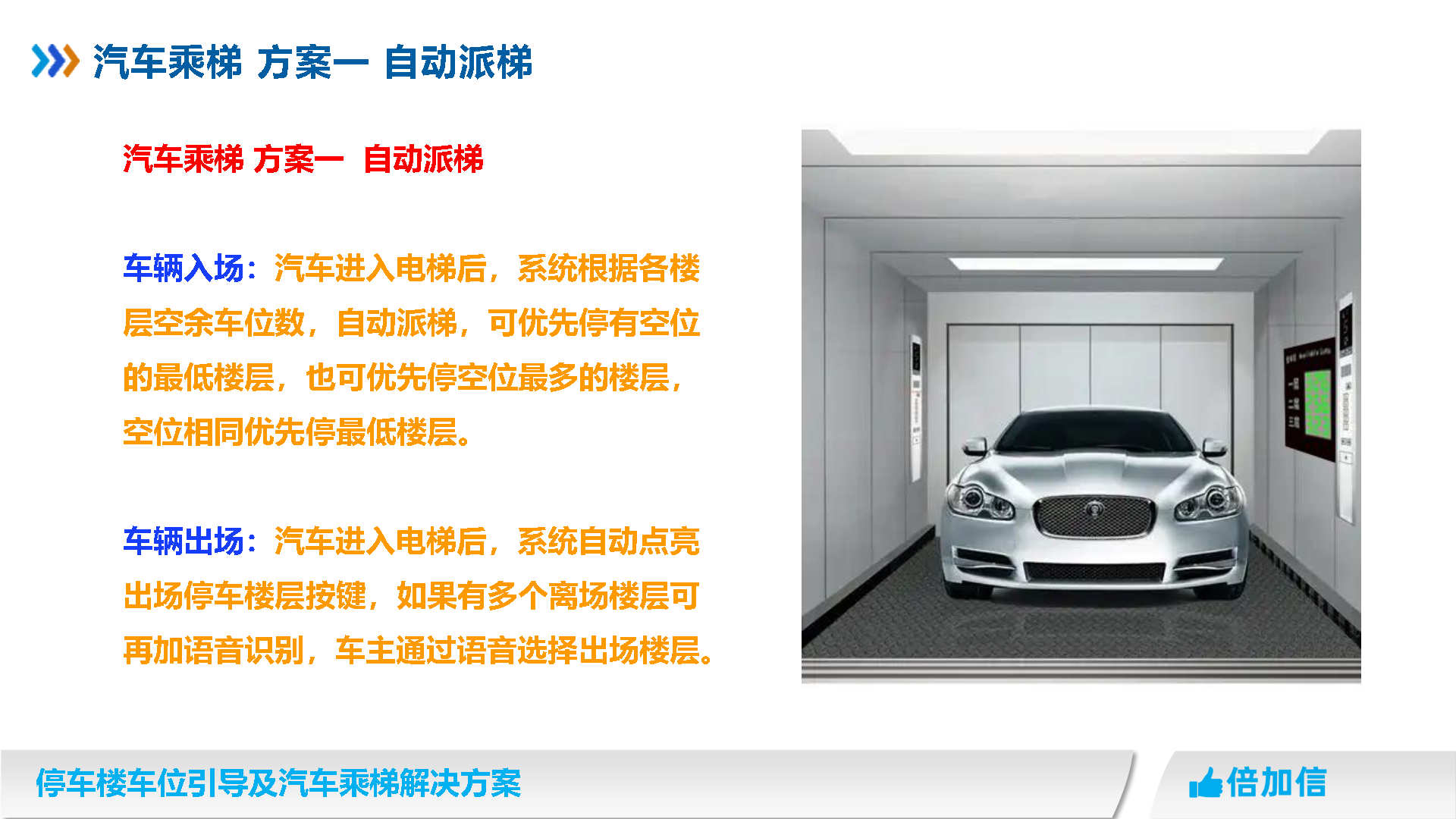 汽車乘梯 方案一 自動(dòng)派梯 車輛入場:汽車進(jìn)入電梯后,系統(tǒng)根據(jù)各樓層空余車位數(shù),自動(dòng)派梯,可優(yōu)先停有空位的最低樓層,也可優(yōu)先�?瘴蛔疃嗟臉菍�,空位相同優(yōu)先停最低樓層。 車輛出場:汽車進(jìn)入電梯后,系統(tǒng)自動(dòng)點(diǎn)亮出場停車樓層按鍵,如果有多個(gè)離場樓層可再加語音識別,車主通過語音選擇出場樓層