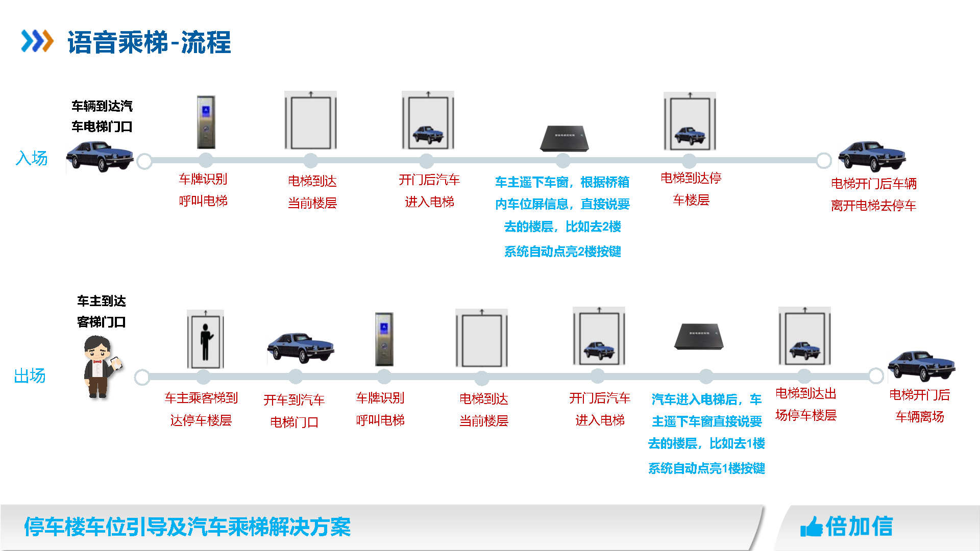 汽車乘梯 方案二 語音乘梯 車輛入場:汽車進(jìn)入電梯后,車主遙下車窗,根據(jù)電梯橋箱內(nèi)車位顯示屏顯示信息,直接說去2樓、去3樓或者去4樓,電梯自動(dòng)點(diǎn)亮對應(yīng)樓層按鍵。 車輛出場:汽車進(jìn)入電梯后,車主遙下車窗,直接說去1樓或者去負(fù)1樓,電梯自動(dòng)點(diǎn)亮對應(yīng)樓層按鍵。