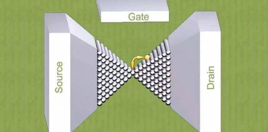 在單原子晶體管中,通過源極和柵極之間的電壓移動(dòng)單個(gè)原子,從而關(guān)閉或打開源極和漏極之間的電路。