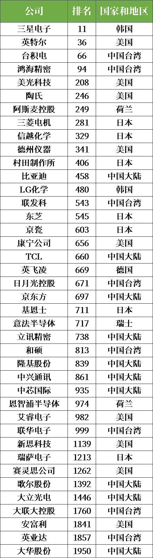 據(jù)統(tǒng)計,2000強(qiáng)榜單中有41家半導(dǎo)體相關(guān)公司其中包括中國大陸企業(yè)10家,中國臺灣企業(yè)9家。