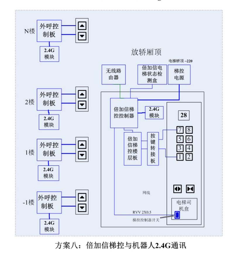 (1)機(jī)器人在電梯外,通過2.4G通訊發(fā)送指令倍加信梯控系統(tǒng),系統(tǒng)自動(dòng)點(diǎn)亮上樓或下樓按鍵,實(shí)現(xiàn)呼梯功能。