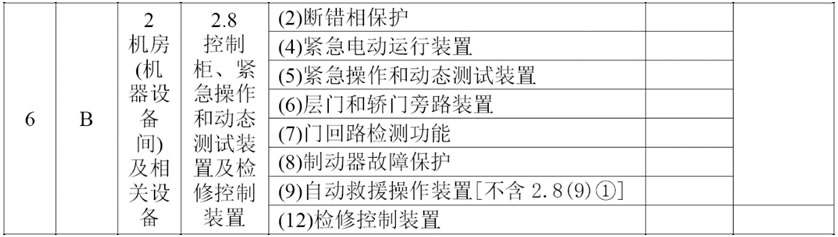 (4)將2.8項(xiàng)的項(xiàng)目及類(lèi)別調(diào)整為“控制柜、緊急操作和動(dòng)態(tài)測(cè)試裝置及檢修控制裝置B”,在檢驗(yàn)內(nèi)容與要求中增加: