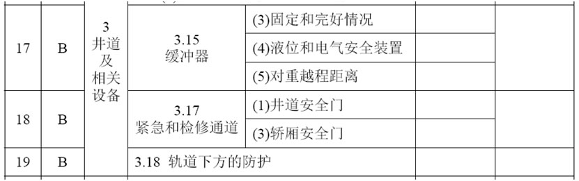 (17)增加3.18項(xiàng),項(xiàng)目及類(lèi)別為:“軌道下方的防護(hù) B”,檢驗(yàn)內(nèi)容與要求為:“如果人員可以進(jìn)入電梯運(yùn)行軌道的下方,應(yīng)當(dāng)設(shè)置無(wú)孔的防護(hù)隔障,以擋住和收納可能從斜行電梯上掉落的碎片或者零件”;