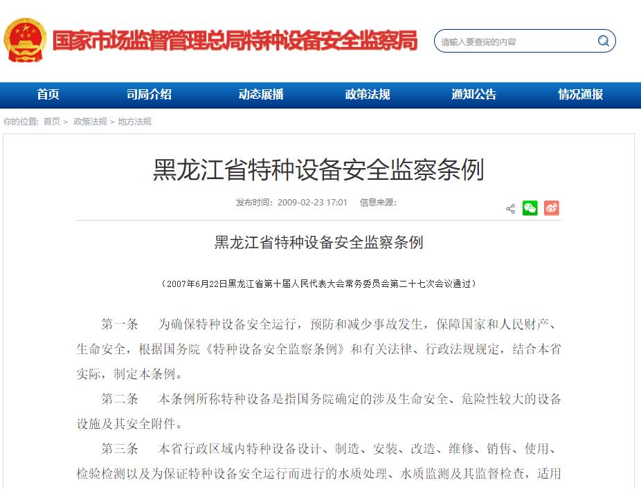 《黑龍江省特種設備安全監(jiān)察條例》2007年6月22日黑龍江省第十屆人民代表大會常務委員會第二十七次會議通過
