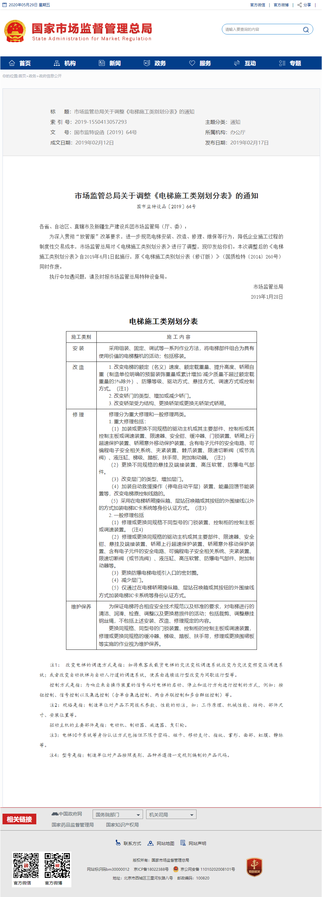 市場監(jiān)管總局關于調整《電梯施工類別劃分表》的通知,說明了電梯加裝梯控所屬類型,說明是容許電梯加裝梯控系統(tǒng)的,電梯加裝梯控是不違法的。